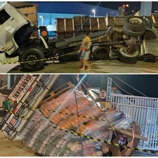 Carreta com carga de refrigerantes tomba no acesso ao Porto do Demétrio; VÍDEO