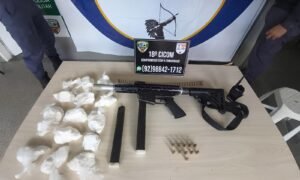 Com o adolescente, os policiais localizaram a submetralhadora com dois carregadores. Na sequência, a equipe foi até uma residência indicada pelo suspeito e encontrou aproximadamente dois quilos de pasta base de cocaína, levando à prisão em flagrante da mulher.