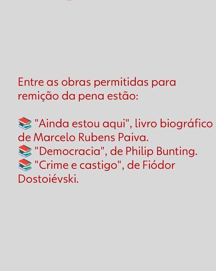 Cada obra lida pode diminuir quatro dias de prisão, mas regra depende de autorização do ministro Alexandre de Moraes