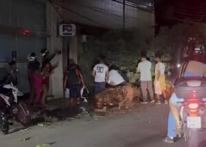 De acordo com testemunhas, o veículo trafegava pela via quando a parte superior da carroceria acabou se enroscando na rede elétrica. Com o movimento, os fios foram puxados com força, exercendo pressão sobre uma árvore próxima, que acabou sendo arrancada pela raiz.