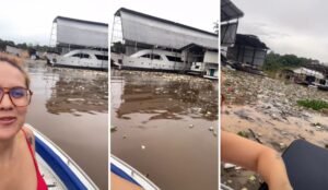 Nas imagens, a artista aparece em um barco mostrando diversos resíduos levados pelas enxurradas, como garrafas plásticas, embalagens descartáveis e até um capacete, que teriam sido arrastados das ruas e despejados no lago. A situação chamou atenção pelo volume de lixo visível em uma área considerada estratégica para o turismo e o transporte fluvial.