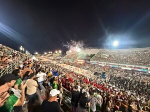 Na sequência, a Vitória Régia emocionou ao homenagear o ex-prefeito de Parintins Bi Garcia, com o enredo “O filho da ilha que encanta o Amazonas”. A porta-bandeira Rafaelle Costa falou sobre a responsabilidade: “Carregar esse pavilhão é carregar uma comunidade inteira”.
