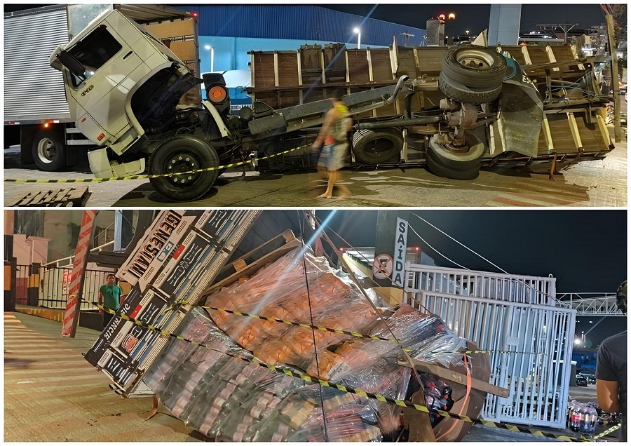 De acordo com informações apuradas no local, o veículo transportava uma grande quantidade de mercadorias que seriam embarcadas ainda na noite desta quinta-feira para municípios do interior do estado. Durante a manobra de acesso ao porto, a carreta perdeu a estabilidade e acabou tombando, espalhando parte da carga pela via.