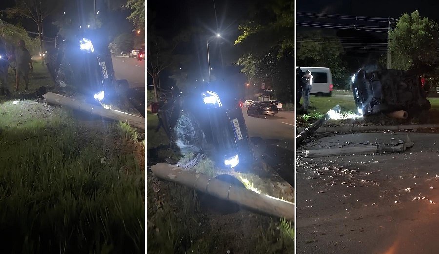 Carro capota e derruba poste, deixando fios expostos na Avenida do Turismo