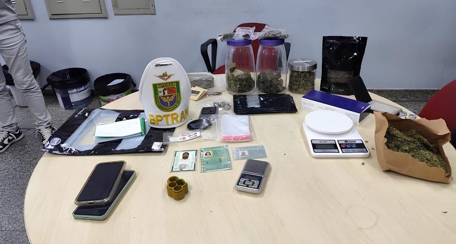A ocorrência foi registrada por volta de 0h40, em frente a um estabelecimento comercial, após os policiais abordarem uma motocicleta que realizava entregas por aplicativo. Durante a revista no compartimento utilizado para transporte de encomendas, os agentes encontraram uma porção de substância com características de entorpecente.