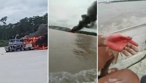 Embarcação foi consumida pelas chamas entre Anamã e Anori; vídeos mostram explosões e ao menos uma vítima com queimaduras