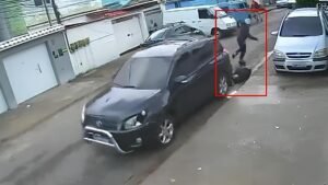 Na sequência, a vítima manobra o carro em marcha à ré e passa por cima do assaltante que já estava caído no chão.