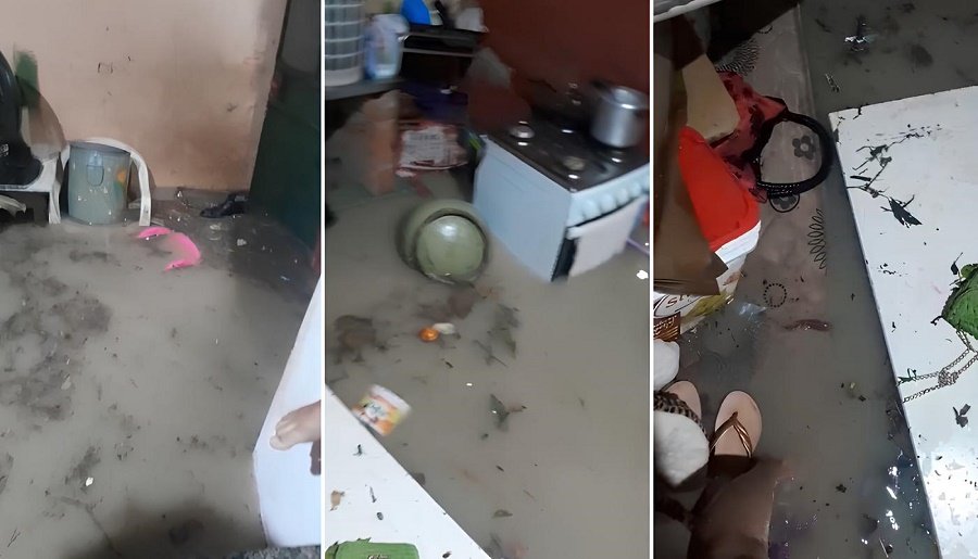 Imagens compartilhadas nas redes sociais mostram o impacto do temporal dentro das residências. Em um dos registros, uma mãe e sua filha aparecem tentando salvar pertences enquanto a água invade rapidamente o imóvel, atingindo móveis e eletrodomésticos.