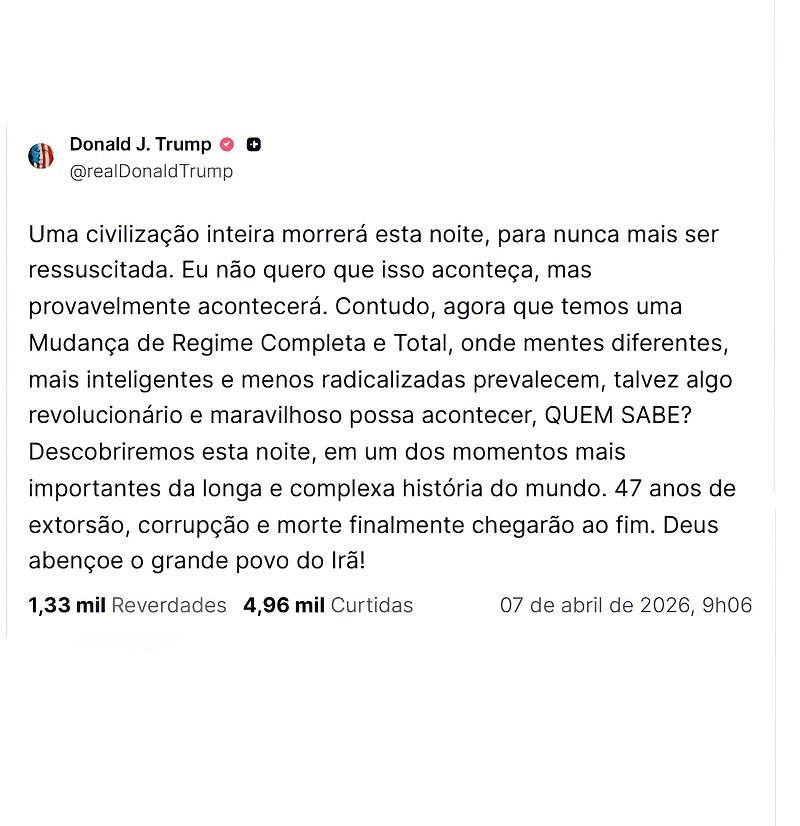 Em publicação na rede Truth Social, Trump ampliou o tom alarmista e destacou a gravidade do momento. “Uma civilização inteira morrerá esta noite, para nunca mais ser ressuscitada. Eu não quero que isso aconteça, mas provavelmente acontecerá. […] Descobriremos esta noite, em um dos momentos mais importantes da longa e complexa história do mundo. 47 anos de extorsão, corrupção e morte finalmente chegarão ao fim. Deus abençoe o grande povo do Irã!”, escreveu o presidente.