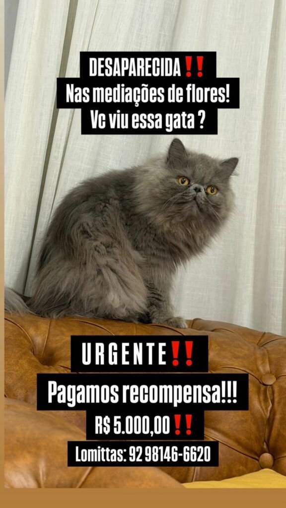Uma família de Manaus está mobilizando as redes sociais em uma busca por gata de estimação, que desapareceu recentemente nas mediações do bairro Flores, na capital amazonense. A família oferece recompensa de R$ 5.000,00 para quem encontrar ou der informações concretas que levem ao paradeiro do animal.