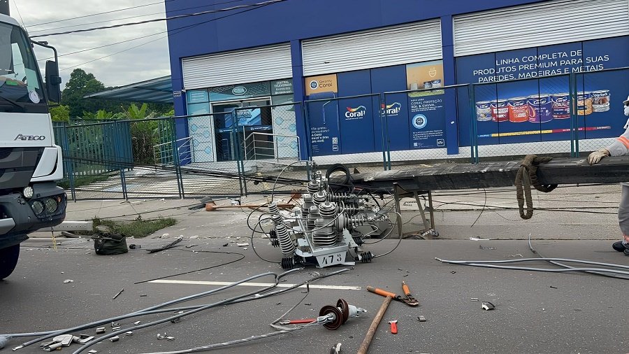 Um acidente de trânsito registrado na manhã desta quinta-feira (2) causou transtornos na avenida Max Teixeira, no bairro Cidade Nova, zona norte de Manaus. Um veículo colidiu contra um poste de energia elétrica, derrubando a estrutura e provocando interrupção no fornecimento de energia na região.