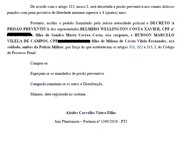 A medida atende a uma representação da autoridade policial, com parecer favorável do Ministério Público do Estado do Amazonas, que apontou indícios de autoria e materialidade, além da necessidade da prisão para garantir a ordem pública e o andamento das investigações.