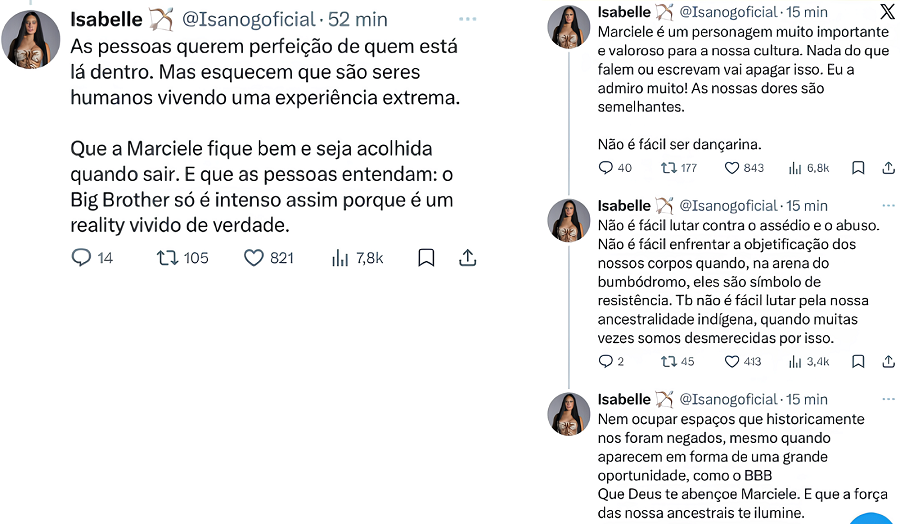 “É triste ver as falas que a Marciele está recebendo por causa de uma crise de ansiedade que ela teve. Só entende o BBB quem já viveu o confinamento. Quem nunca esteve lá dentro não faz ideia da pressão emocional”, declarou Isabelle.