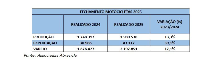 No mesmo período, as associadas da Abraciclo embarcaram 3.495 motocicletas para o exterior, alta de 38,8% em relação a dezembro de 2024 e 23,4% menor que em novembro.