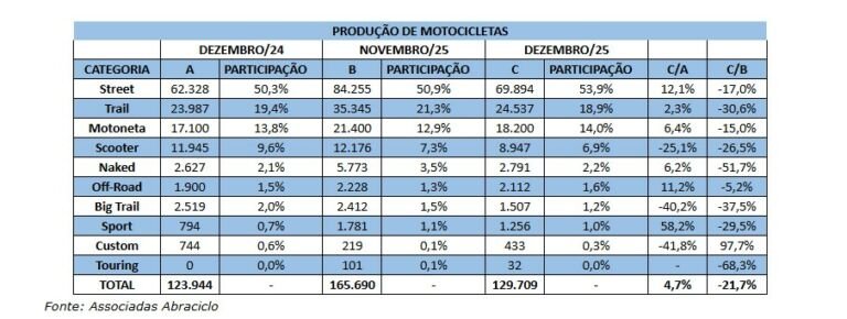 De acordo com dados da Abraciclo, a indústria de motocicletas registrou o segundo melhor desempenho para o mês de dezembro com a produção de 129.709 unidades. O volume representa alta de 4,7% em relação a dezembro de 2025 e queda de 21,7% na comparação com novembro.