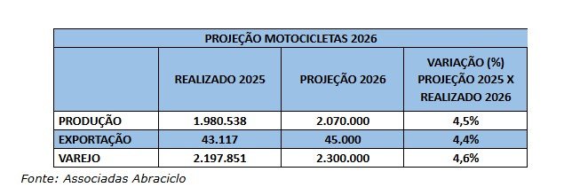 As exportações também devem apresentar resultado positivo. A Abraciclo estima que 45.000 motocicletas sejam destinadas ao mercado externo em 2026, crescimento de 4,4% na comparação com as 43.117 unidades exportadas em 2025.