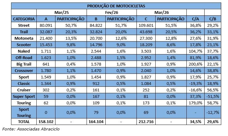 Dentro da nova classificação, a categoria mais produzida no primeiro trimestre foi a Street (290.340 motocicletas e 51,7% da fabricação total). Na sequência, vieram a Trail (112.031 unidades e 20% da produção) e a Motoneta (73.600 unidades e 13,1%).