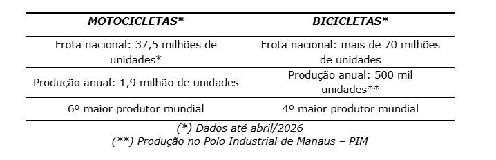 A fabricação nacional de motocicletas, quase totalmente concentrada no Polo Industrial de Manaus (PIM), está entre as seis maiores do mundo. No segmento de bicicletas, com as principais fábricas também instaladas no PIM, o Brasil se encontra na quarta posição entre os principais produtores mundiais. No total, as fabricantes do Setor de Duas Rodas geram mais de 21 mil empregos diretos em Manaus/AM e mais de 150 mil em todo o Brasil.