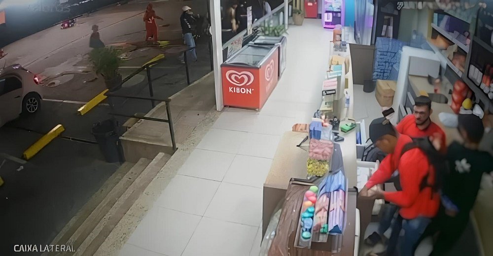 Por volta das 2h38, dois suspeitos aparecem dentro da loja e seguem diretamente para o caixa. Armados com uma faca, eles intimidam o atendente e recolhem o dinheiro disponível. Além disso, bebidas alcoólicas também foram levadas das prateleiras.