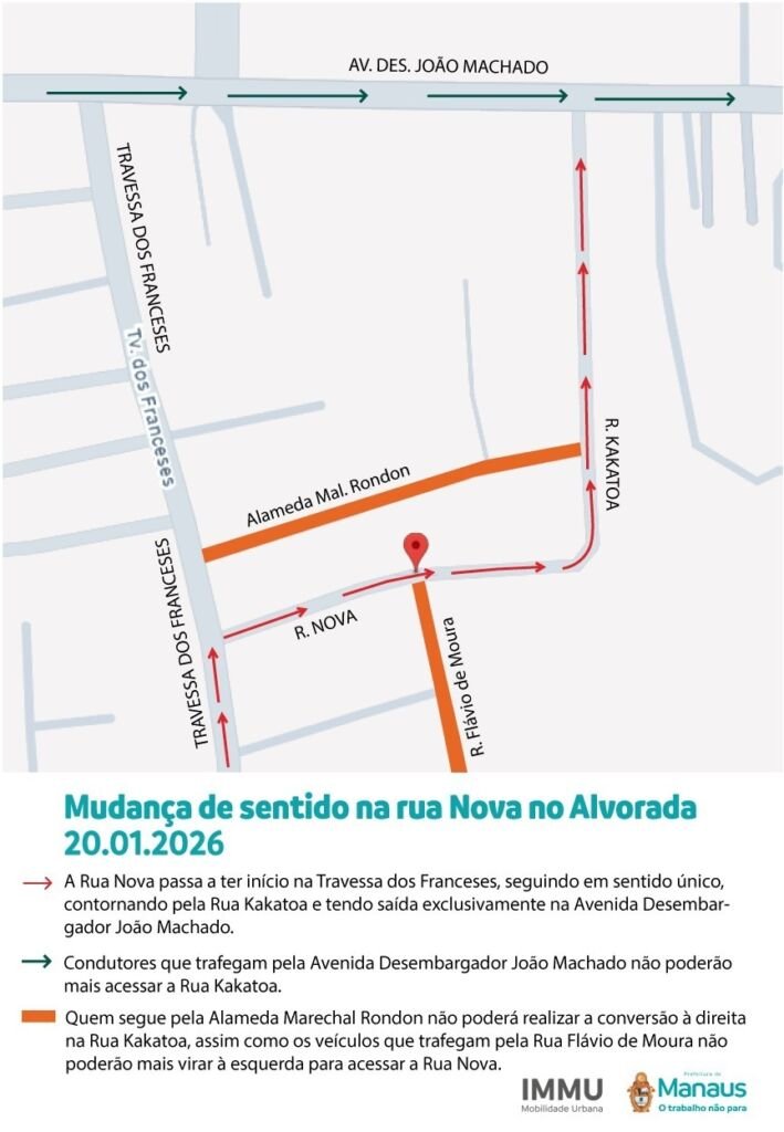 Manaus – O Instituto Municipal de Mobilidade Urbana (IMMU), informa à população sobre a mudança de sentido viário da rua Nova, localizada no bairro Alvorada, zona oeste da capital, que passa a valer a partir de terça-feira (20). Com a nova configuração, a rua Nova passa a ter início na travessa dos Franceses, seguindo em sentido único.