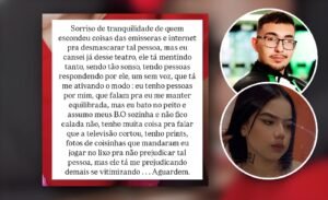 Em uma sequência de stories no Instagram, a jovem afirmou ter escondido informações das emissoras de TV e da internet para “proteger” Betinho, mas agora pretende revelar tudo. “Sorriso de tranquilidade de quem escondeu coisas das emissoras e internet pra desmascarar tal pessoa, mas eu cansei já desse teatro, ele tá mentindo tanto, sendo tão sonso… que tá me ativando o modo: eu tenho pessoas por mim”, escreveu ela.