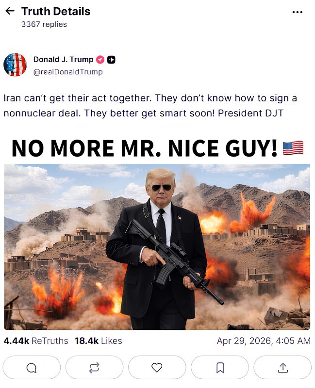 EUA – O presidente Donald Trump elevou a tensão diplomática nesta quarta-feira (29) ao publicar uma mensagem agressiva em sua rede social, ‘Truth Social’. A postagem apresenta uma montagem de Trump segurando uma arma, cercado por explosões, acompanhada da frase: “Chega de ser bonzinho” (No more Mr. Nice Guy). Trump exige que Teerã abandone as ambições nucleares antes de qualquer cessar-fogo ou alívio econômico.