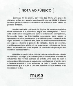 O Musa informou, em nota, que os órgãos de segurança pública foram acionados imediatamente e que a ocorrência segue em investigação. O museu também destacou que possui vigilância 24 horas e monitoramento constante durante o horário de visitação.