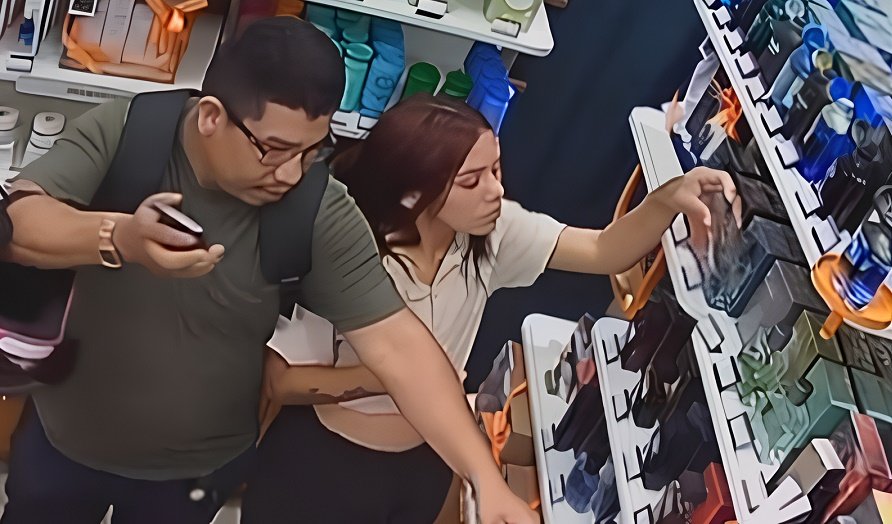 De acordo com o vídeo, o casal se passa por clientes e experimenta diferentes fragrâncias para não despertar suspeitas. A mulher aproveita os momentos em que a vendedora se afasta para atender outros consumidores e, de maneira discreta, retira frascos das prateleiras. Parte dos itens é escondida dentro da própria calça, enquanto outros são colocados na mochila levada pelo comparsa. O homem acompanha toda a movimentação e auxilia no armazenamento dos produtos.