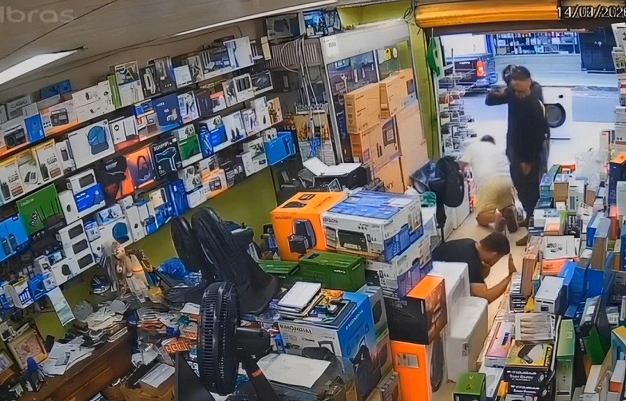 Nas imagens, os suspeitos aparecem chegando rapidamente ao local e entrando no comércio. Dentro da loja, eles rendem funcionários e clientes e anunciam o assalto, fazendo ameaças durante a abordagem.