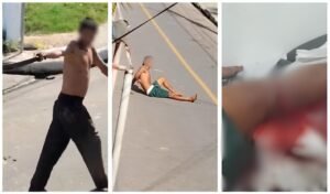 Nas imagens, o suspeito aparece empunhando a arma branca enquanto olha para trás e profere ameaças contra outra pessoa que está sentada na via. A vítima apresenta um corte profundo no joelho e aparenta estar ferida.