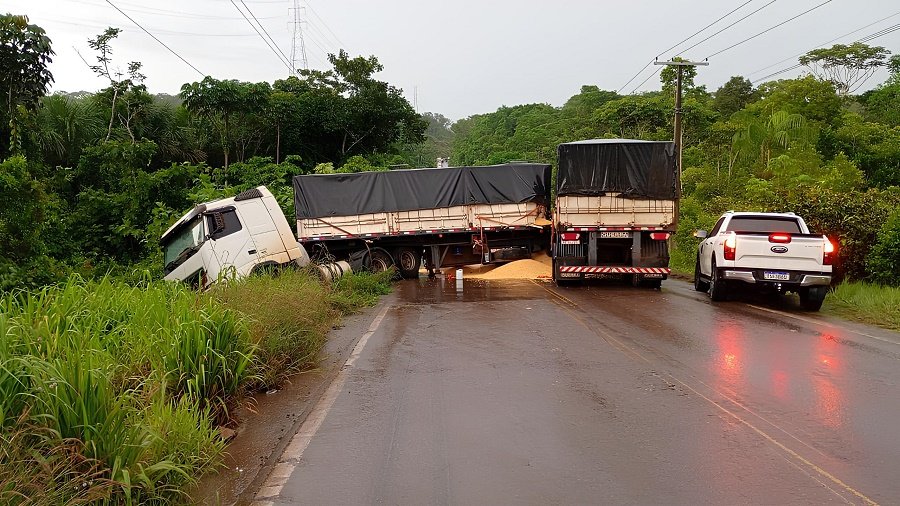 O tráfego na BR-174, rodovia que liga os estados do Amazonas e de Roraima, foi totalmente interrompido na noite desta segunda-feira (29) após um caminhão bitrem carregado de milho ficar atravessado na pista. O incidente causou bloqueio total da via e formação de longas filas de veículos.